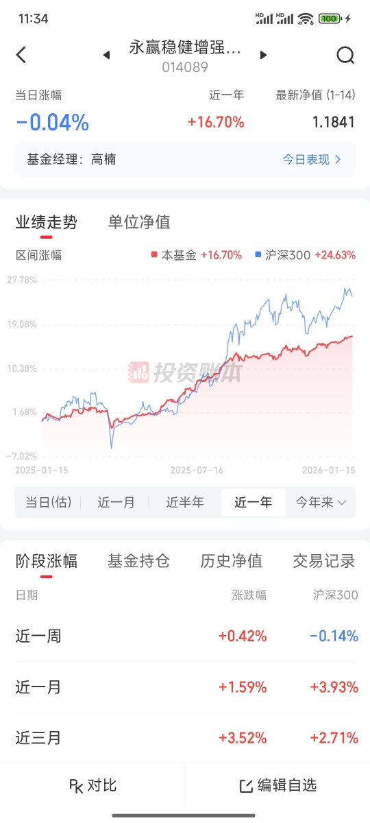 A股要走出一波春节行情了,要是早上车就好了,但现在上车也不晚,逛讨论区发现永赢稳健增强C014089这只不错,近六个月下蛋1001个,近一年下蛋1642个,比其它的固收+都优秀,话说股债跷跷板,股市不会一直牛,而债市则长牛,加油。