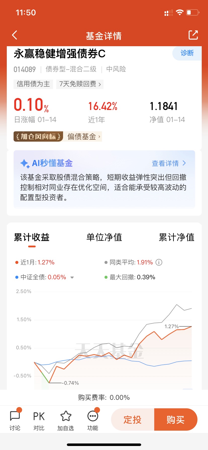 $永赢稳健增强债券C$ 采用股债混合策略,具备较强的市场容量与流动性,昨天收了10个蛋,四连涨收了46个蛋,近一个月127个蛋,近三个月411个蛋,近半年1001个蛋,近一年1642个蛋,各个阶段的业绩表现都很优秀,可见业绩弹性和业绩爆发力都很强,这里主要以信用债和利率债固收打底,而且是7天免赎回费的一个,期待接下来的表现了!#2025超额关键词#