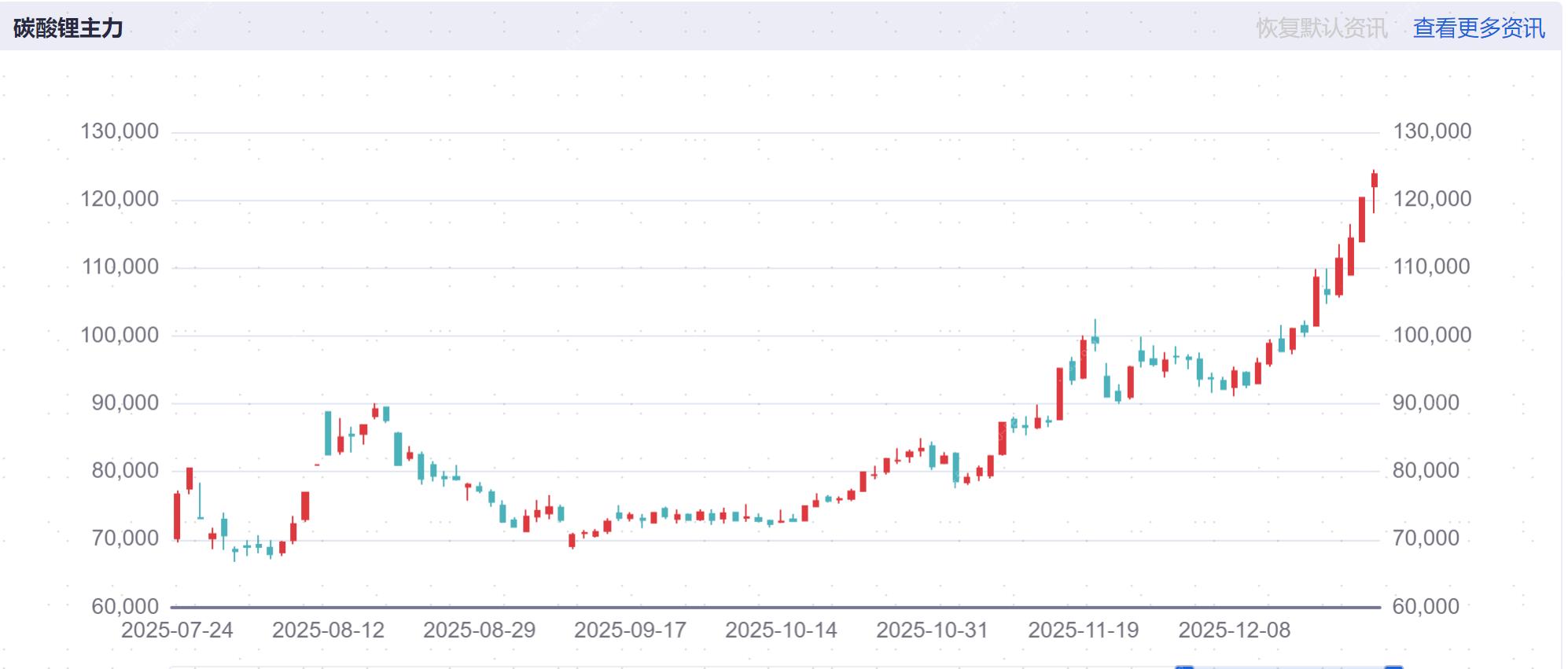据iFind数据显示,12月24日,广期所碳酸锂主力合约涨幅超过5%,报12.18万元/吨,价格创下自2024年5月份以来的新高,年内累计涨幅超60%。锂矿作为典型的周期行业,产品价格的上涨有望带动业绩的回暖,进而推动板块行情的上涨。