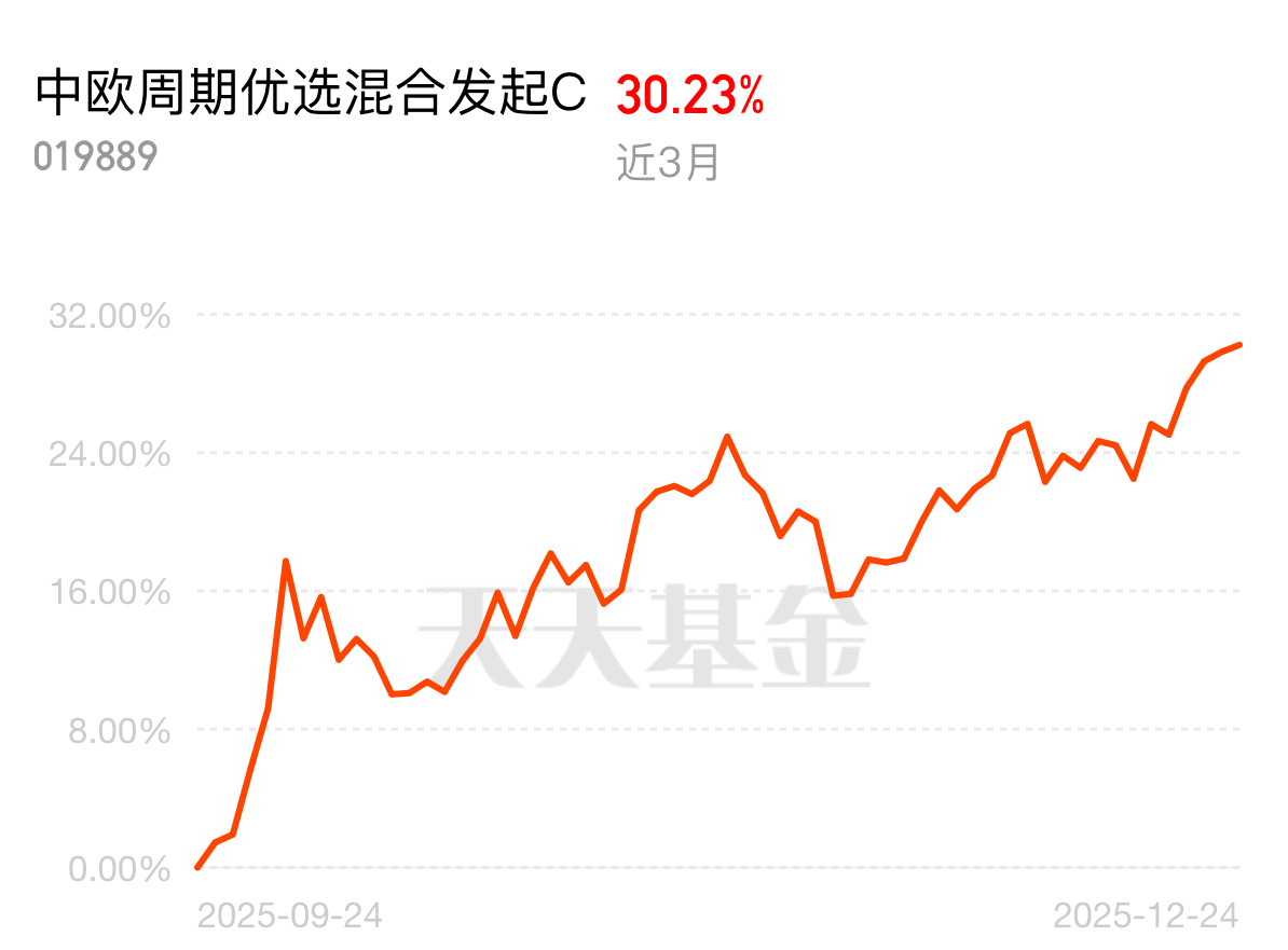 近期黄金白银价格屡创历史新高,贵金属板块吸金力拉满。中欧周期优选混合发起 C 在周期资源类主动基金里排名靠前,近 3 月涨 30.23%,短期资金青睐强劲,还贴合全球绿色转型的长期趋势,配置正当时。$中欧周期优选混合发起C$