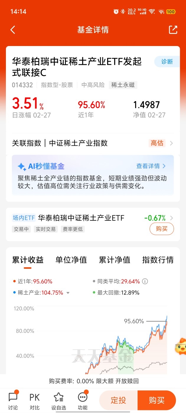 今日稀土指数小幅波动,盘中有震荡,但整体格局依然偏强。现货端货源偏紧,厂家惜售情绪明显,低价货很难找到,价格比节前明显上涨,行业供需格局持续向好。虽然大盘整体偏弱,但稀土板块抗跌性很强,资金依旧聚焦核心龙头,说明赛道热度没退。短期波动不用慌,反而给想上车的朋友留出更舒服的位置,中长期看,政策支持+需求复苏+供给管控,三大逻辑都在。不想盯盘、不想研究个股,选华泰柏瑞就很省心,紧跟板块行情,分散风险,适合大多数普通投资者,市场有风险,投资需谨慎。#3月基金投资策略# $华泰柏瑞中证稀土产业ETF发起式联接C$
