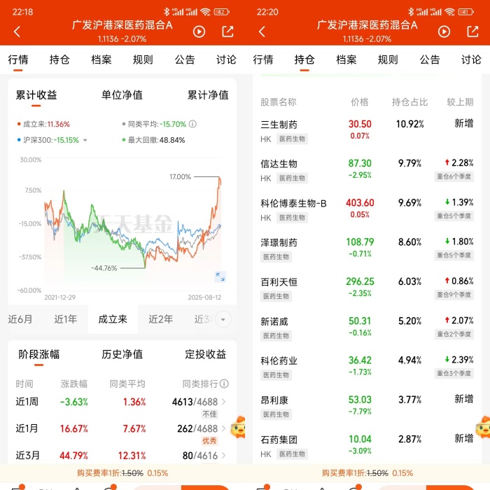 在今年的创新药行情里,吴兴武经理管理的$广发沪港深医药混合A(014114)$比较出色,第一季度与第二季度都是优秀业绩,截止8月12日,今年涨了71.96%,同类排名40/4472,摆脱了2023年与2024年连续两年的低迷气氛,非常优秀。这只基金一直由吴经理管理,2021-12-29成立以来涨了11.36%,医药行情的起伏不定,能在低位买入的有几个呢?不能准确择时,长期持有才是正解了,低位买入或开始定投可以摊薄成本,在成长的过程中尽早扭亏为盈了。