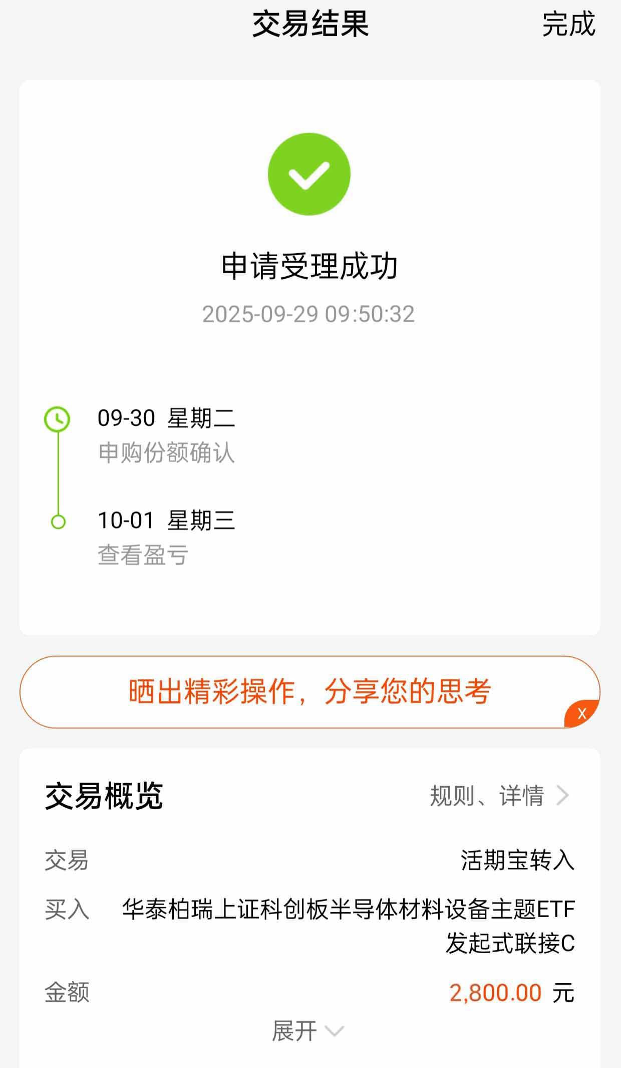 尾盘半导体持续上行,科创半导体设备领涨细分板块。三季报是验证科技板块景气周期的重要窗口,性价比消化后产业趋势和景气优势共振有望带市场聚焦成长主线。$华泰柏瑞上证科创板半导体材料设备主题ETF发起式联接C$(024975)直指半导体上游核心的材料与设备领域,今天大涨2.13%,是国产替代下的受益方向。