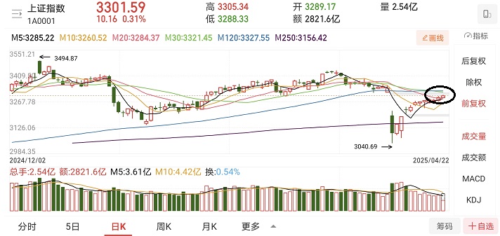 4月22日港股A股涨跌互现,且幅度都比较小,截止上午收盘,上证指数涨0.31%,暂收3301.59点,成功收复3300点大关。深证成指跌0.41%,创业板指跌0.98%,恒生指数微绿0.04%,恒生科技指数跌0.52%。A股总成交量7126亿,相比上一个交易日同期放量639亿,估计全天量能在1.2万亿左右。两市有2069只个股上涨,有3121家下跌。上证指数踩着5天20天均线小幅反弹,走出一根红色小K线,继续回补上方缺口。30天均线微微下行,距离越来越近,明后天有可能尝试收复这根关键均线。我认为大盘接下来仍然以震荡上行回补缺口为主,我今天继续加仓云计算与大数据、港股创新药、港股银行、中证500、黄金。