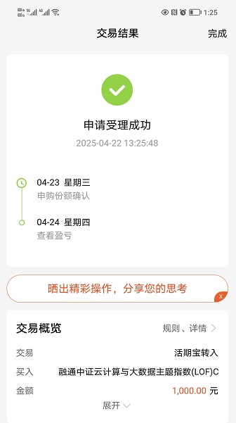 1.云计算:我今天继续加仓$融通中证云计算与大数据主题指数(LOF)C$ 1000元,这支基金是中证云计算与大数据主题指数(930851)的ETF联接基金。这个指数选择基础设施供应商、平台服务与应用提供商、领先的第三方软件开发商等,以及与云计算与大数据相关的代表性沪深A股作为样本股。指数经历了三连阳后今天走出一根小绿K线,回踩了5天10天均线获得了支撑,K线重心继续上移。现在5天10天均线已经粘合,明天有望形成金叉。我认为A股未来5年的主线在科技方向,成长的路上可能经历各种挑战,但震荡上行的大趋势改变不了。最近人形机器人马拉松比赛刷屏,云计算与大数据是人工智能、AI大模型的底层技术支撑。人工智能要快速发展,云计算与大数据需求旺盛,未来的发展不可限量,现在我们不能简单的用估值几倍来定义其便宜还是贵。趁着今天本指数小幅回调,我今天继续低吸本基金,坚持中长期做多它。下面我晒一下买入操作记录: