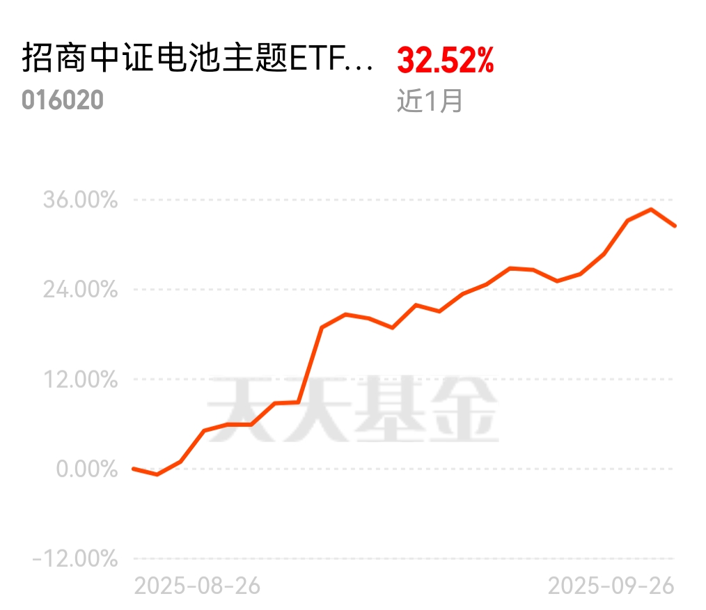 看这行情就知道,电池不是短期炒作,新能源汽车、储能都在拉需求,长期趋势明摆着。招商中证电池主题ETF联接C近1个月32.52%的涨幅很实在,持仓的朋友偷着乐吧。$招商中证电池主题ETF联接C$