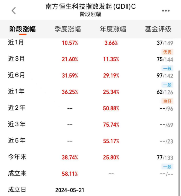 对于普通投资者来说,想要抓住港股科技的机会,其实并不需要自己去研究每一家公司。最简单有效的方法,就是选择一款紧密跟踪恒生科技指数的基金。南方恒生科技指数发起(QDII)C (A类:020988 C类:020989)$南方恒生科技指数发起(QDII)C(OTCFUND|020989)$就是一个不错的选择。这款基金不仅能够精准跟踪指数,还能根据市场变化主动调整仓位,确保始终紧跟港股科技的发展趋势。从业绩表现来看,南方恒生科技指数发起(QDII)C近一个月的涨幅达到了10.57%,成立以来更是取得了58.11%的收益,这样的成绩在同类基金中表现十分亮眼。更重要的是,作为QDII基金,它拥有充足的投资额度,投资者不用担心想买的时候买不到。