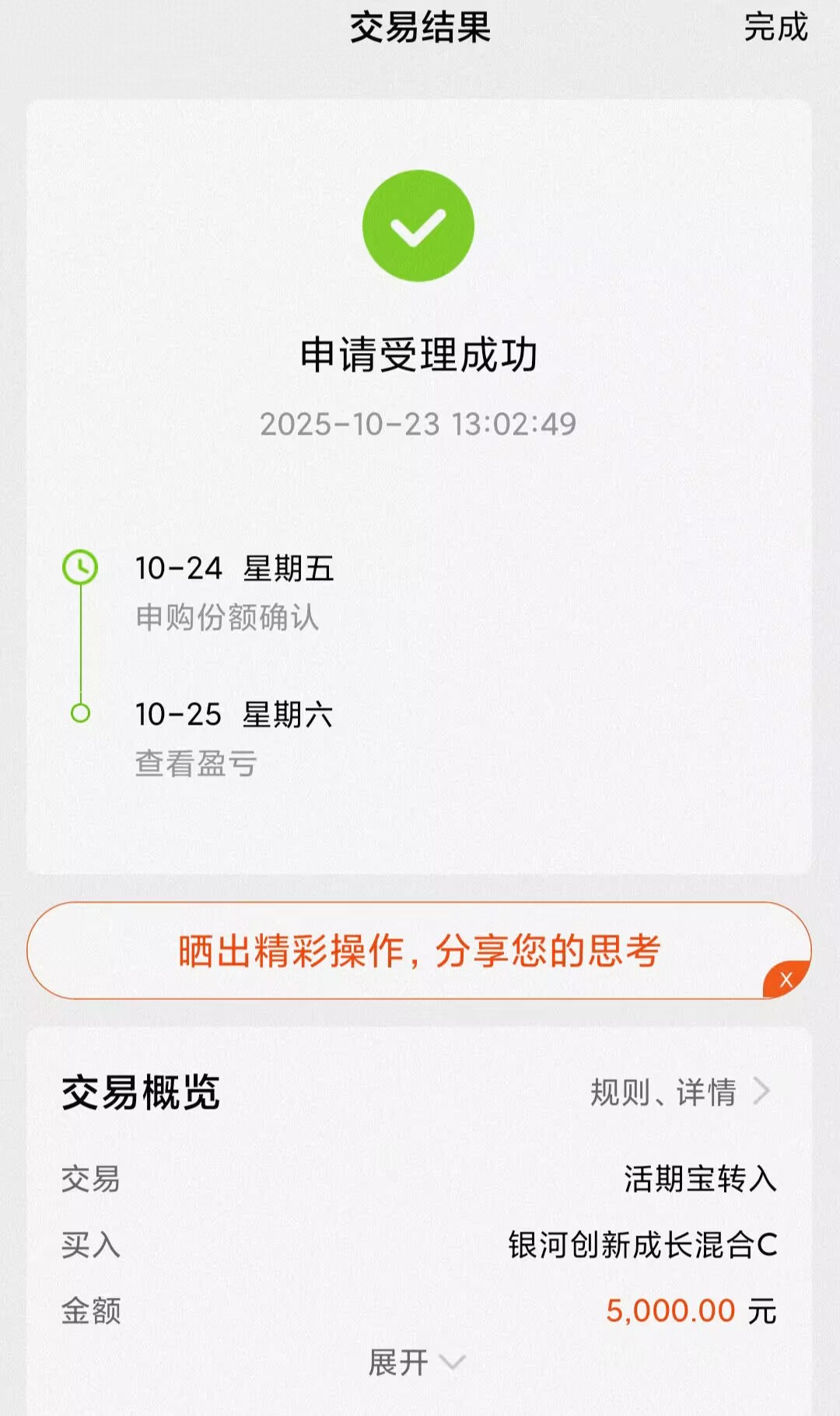加仓5000元$银河创新成长混合C(OTCFUND|014143)$,该基金长期聚焦半导体、集成电路、AI算力等硬科技领域,在之前几个月持续上涨,该基金收获颇丰,明显跑赢半导体指数,近几天市场风格有所切换,科技也出现了不同程度回调,不过我认为这只不过是大涨过后的正常修复,反而可以看做是难得的加仓机会。当前正值三季报,在需求复苏和新动能(如AI)的驱动下,半导体展现出强劲的增长韧性,比如寒武纪前三季度实现营业收入46.07亿元,同比增长2386.38%,后续两周,尤其在10月30日与31日,半导体设备及零部件公司将迎来三季报密集披露期,三季报的公布将会对半导体形成一定的利好支撑,随着Q3季报密集期结束,市场磨底阶段有望基本完成。