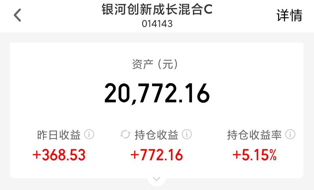 1.加仓5000元$银河创新成长混合C(OTCFUND|014143)$,上周四我精准抄底该基金,结果周五就暴涨5.67%,昨天又涨了2.39%,涨起来真给力,我目前已经赚了772元,感觉很不错。该基金长期聚焦半导体、集成电路、AI算力等硬科技领域,并且基金经理擅长挖掘基本面,精选个股,使得其弹性比较大,在本轮牛市中表现十分亮眼,近一年收益72.87%,今年涨幅58.06%,要明显强于半导体指数基金。