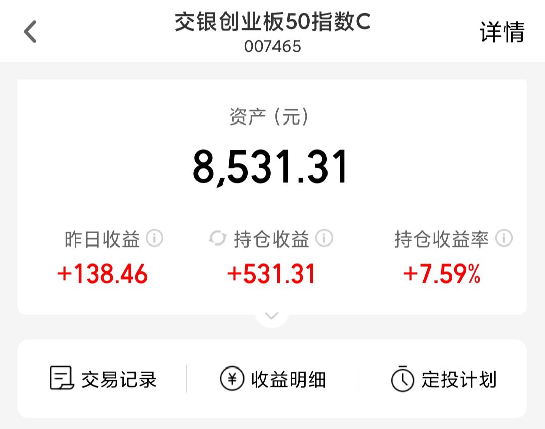 2.加仓1000元$交银创业板50指数C(OTCFUND|007465)$ 创业板之前连涨3天,三天累计涨幅约5.6%,该基金净值也是连续三天上涨,三天涨幅5.83%,比创业板涨幅更高,今年以来累计上涨56%,也要明显强于创业板指数年度涨幅,这是因为该基金跟踪指数创业板50从创业板中流动性高、成长性高的龙头公司,并且剔除了与科技成长属性相关度较低的板块,更集中地覆盖电子、通信、电力设备、医药生物等优势科技赛道,在牛市中往往表现出更强的进攻性和收益弹性。