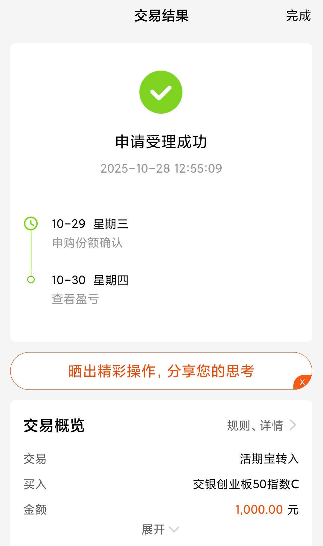 当前的实际环境就是A股已经进入到牛市,尤其是今天上证指数突破了4000点大关,这更加增强了投资者信心,此外,从消息面上看,三季报显示创业板50成分股多数业绩实现高增长,比如新能源龙头宁德时代前三季度净利490.34亿元,同比增长36.2%,CPO龙头中际旭创前三季度实现营收94.90亿元,同比增长54.65%,最近全球头部AI客户正在大幅上调对1.6T光模块的采购预期,更刺激中际旭创,新易盛等连创新高,目前看创业板50整体走势良好,我决定今天继续加仓1000元该基金增大仓位。
