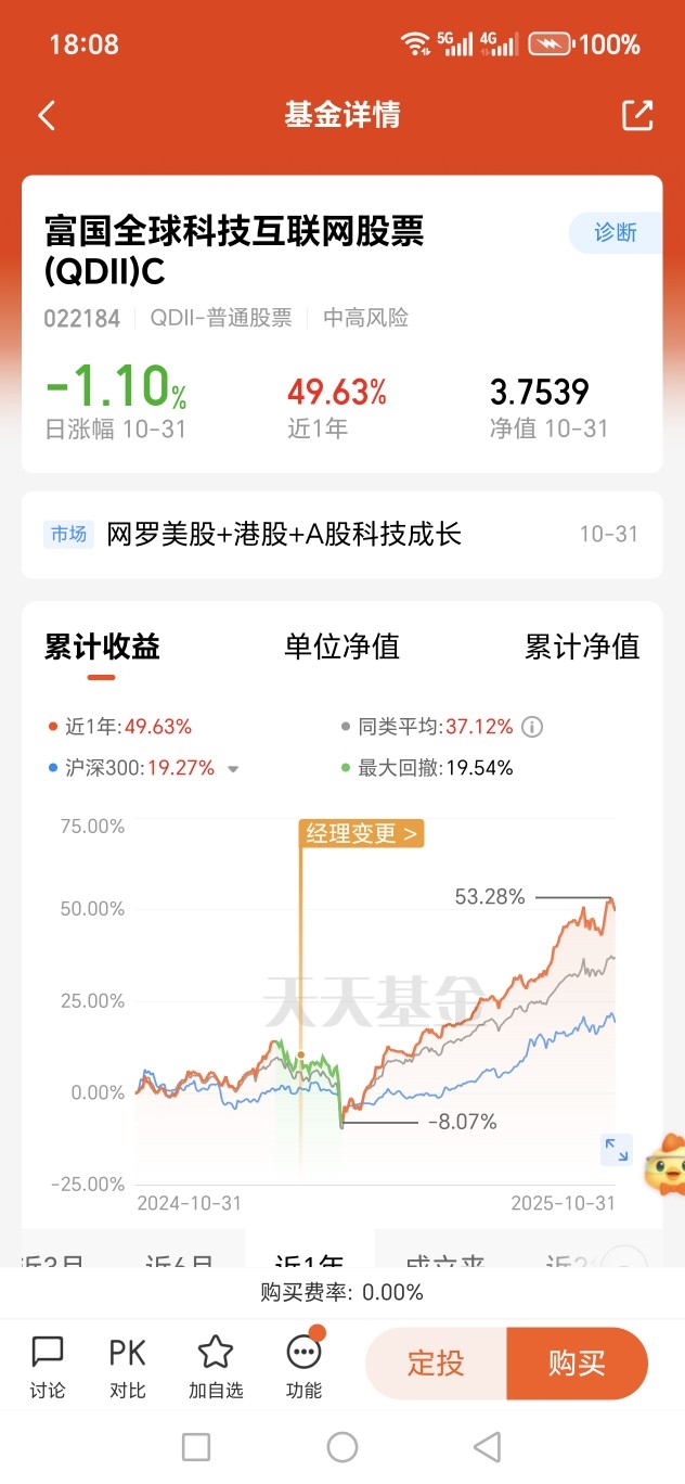 我拿中欧医疗创新A的同时也配了富国全球科技互联网C,它最近调仓更偏美股科技股了,主投全球科技成长,这赛道里还挺稀缺的。关键是纳指和同类都限购了,它还有额度!近3个月涨了21%,6个月46%,一年48%,跑赢一大片。前十大重仓有腾讯、谷歌、台积电、阿里这些巨头,回本速度也快亏最狠时40天就翻回来了。科技这波我继续拿着!
