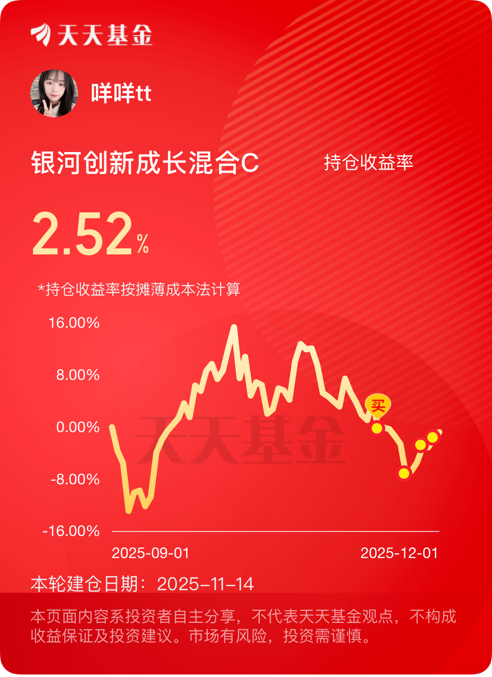 近1周涨了6.39%,今天调整下放缓下节奏也是正常的,各位不要慌!AI大浪仍在,芯片作为确定性最强分支之一,定不会辜负众望。下跌的时候反其道而行方能攒到便宜筹码,我上次趁回调逆市布局$银河创新成长混合C$ 就是很好例子。#晒收益#