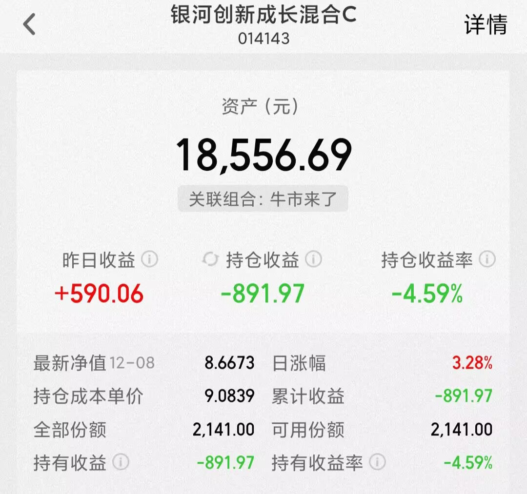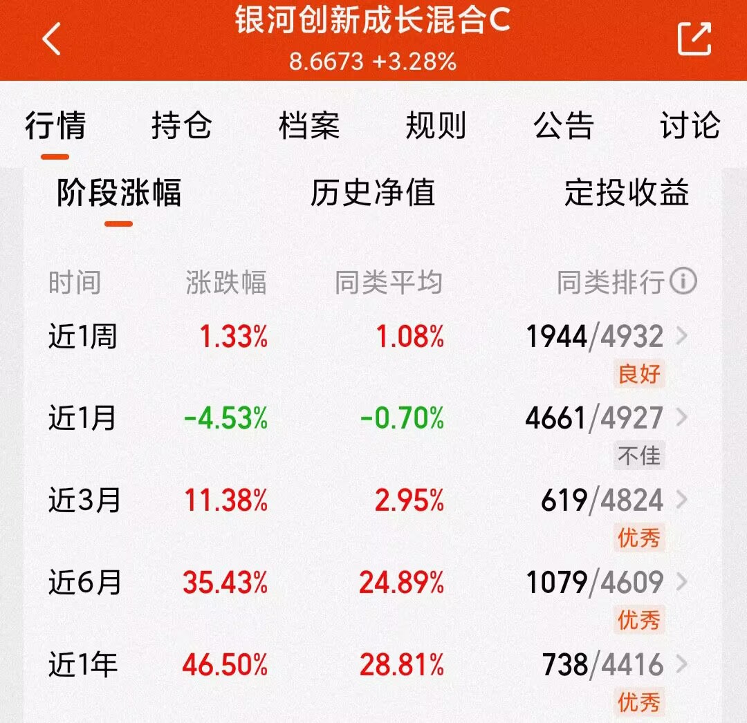 科技这几天强势归来,作为科技代表之一的半导体在昨天也是大幅上涨,个人持有的$银河创新成长混合C(OTCFUND|014143)$全面持仓科技股,其中以半导体为主,弹性大,昨天涨幅高达3.28%,我昨天一天就赚了590块,目前该基金年度涨幅40.95%,近一年大涨46.5%,多阶段超越半导体指数基金,表现优秀。今天科技表现也依旧不错,AI芯片龙头寒武纪股价也再次超越贵州茅台成为当前A股股价最高的公司。