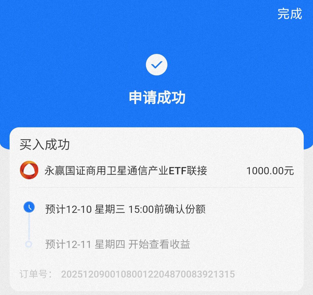 今日买入1000元 $永赢国证商用卫星通信产业ETF发起联接C(OTCFUND|024195)$ 这只基金是卫星通信指数基金,永赢基金在三年前就低位布局卫星互联网了,聚焦卫星互联网、商用航天的全市场唯一主动基是永赢,第一支指数基还是永赢!最近这只基金涨的非常好,8天涨了7天,持续赚钱效应比较高,最近卫星这波涨势很有去年机器人那意思啊,为什么这个指数涨的比较好?一方面是它的科技属性比较强,本轮科技牛市明显,还有一方面是近期对于卫星通信的利好较多,包括商业航天司的成立、十五五规划第一次把“航天强国“写进去,朱雀三号(可回收火箭)的成功发射,还有多家企业宣布近期发射可回收火箭……等,这成为其爆发的诱因。