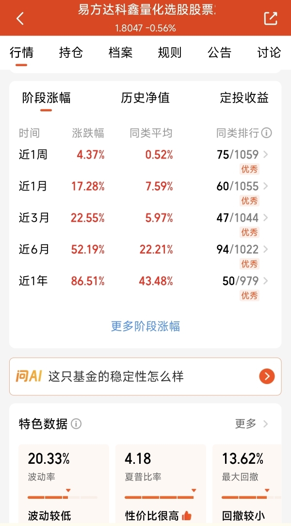 现在市场整体呈现分化。板块轮动比较快。单一板块延续性不高。波动还是比较大。在这种轮动上涨的分化行情中,我还是看好量化的稳定收益表。易方达科鑫量化选股股票。采用量化选股,分散化的投资。能够把握更多赛道成长的红利,而且遇到波动回撤小,近一年涨幅86.51%。大幅跑赢了同类量化基金,长期的业绩,目前市场轮动还是比较快,牛市不踏空,还是这种量化的稳定收益表现好。