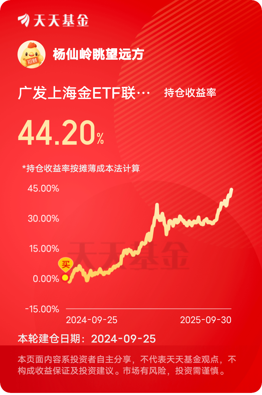 #天天基金13岁啦# 2024年5月入手$广发上海金ETF联接A$ 时,伦敦金价刚突破2300美元/盎司,彼时谁也没想到这会是一轮大牛行情的起点。截至2025年9月末,基金净值从1.3元升至1.8771元,我的持仓收益突破40%,这段投资经历不仅收获了收益,更沉淀出震荡市中的资产配置智慧。