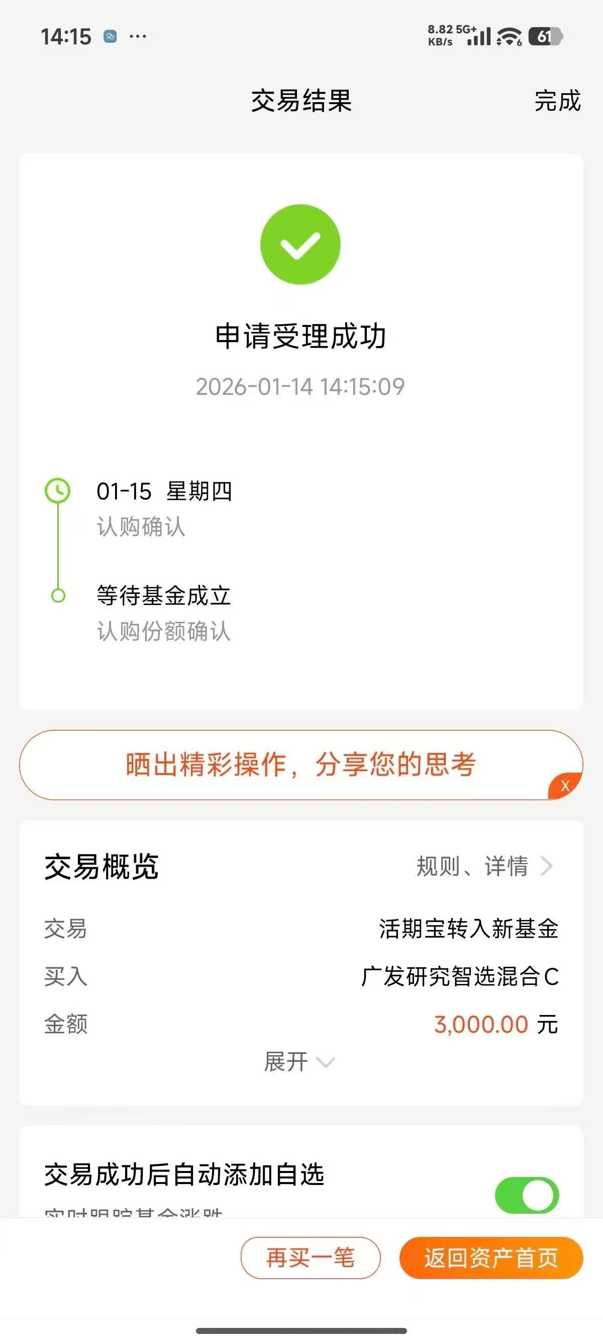 拿着这只当了底仓,今天又买了这个经理管理的这只新基广发研究智选,丰富一下持仓,趁着最后倒计时,买了5000试试$广发研究智选混合C$