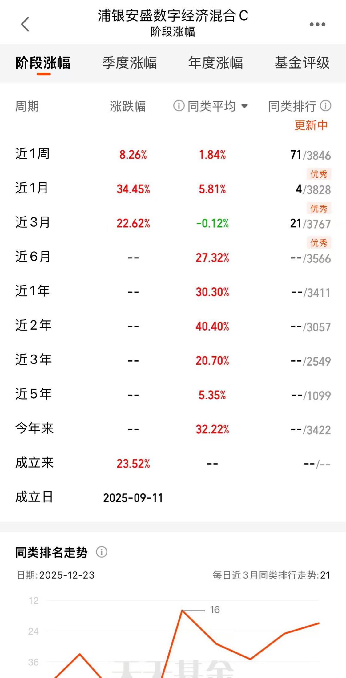 浦银安盛数字经济近一月,三月都是TOP,热门的CPO中航、永赢都限大额了,这个冲的猛的新基还可以吃大肉$浦银安盛数字经济混合C$