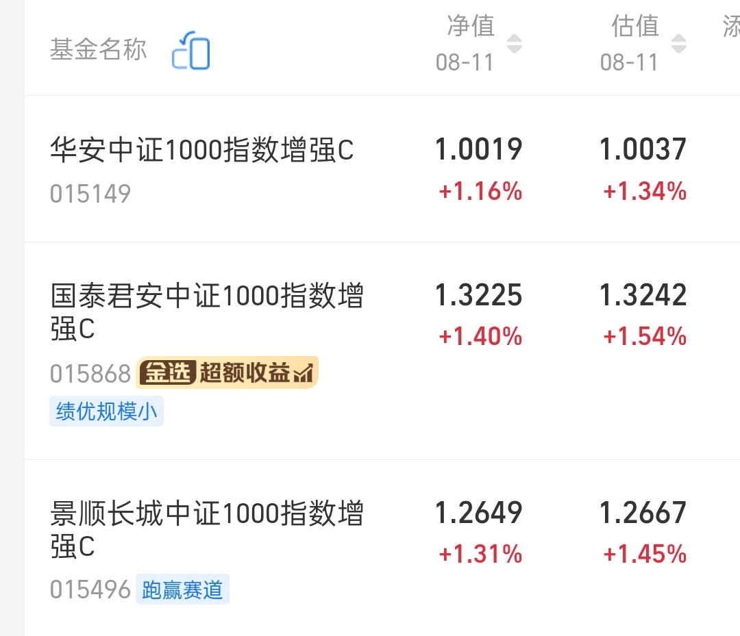 今日中证1000指数的行情表现还是很不错的,咱们一起来看看各家基金的变化吧!$国