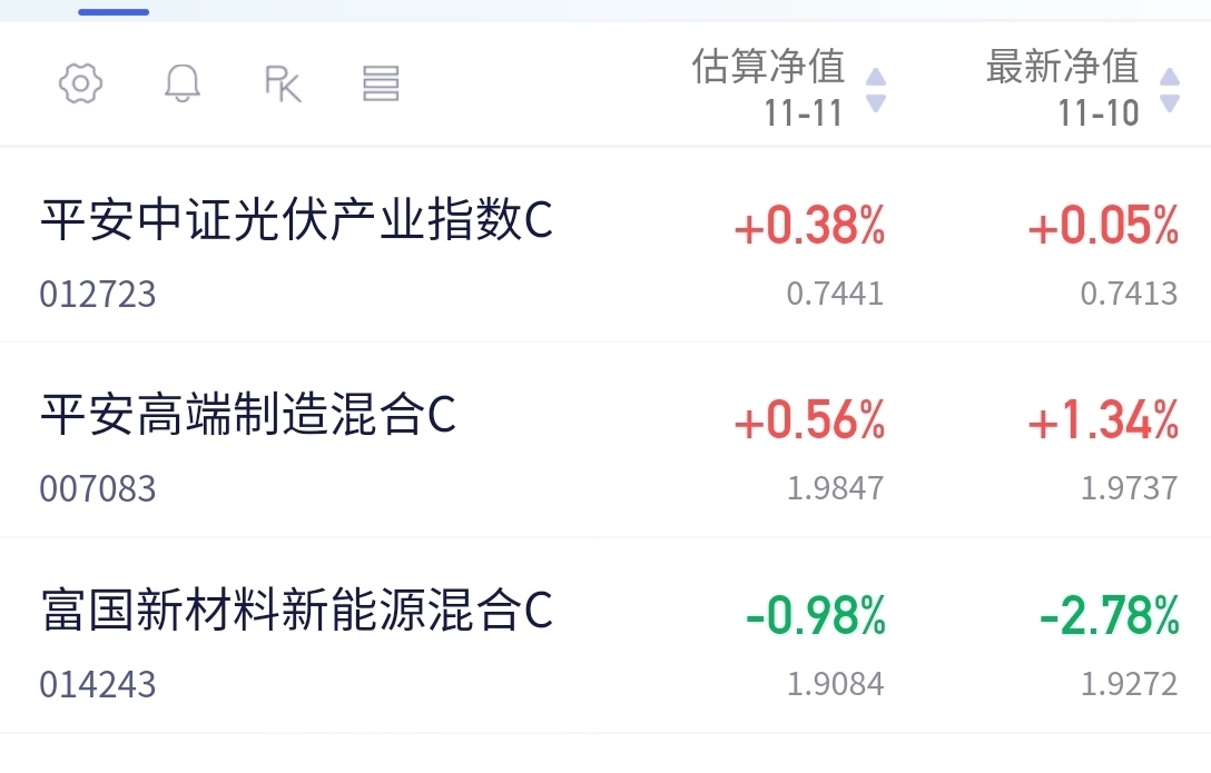 资金对新兴产业的追捧越来越明显,毕竟这些行业代表未来发展方向,长期成长空间没的说。$平安中证光伏产业指数C$ 紧跟趋势,今日净值上涨0.38%,$平安高端制造混合C$ 涨0.56%,用实打实成绩说话。$富国新材料新能源混合C$ 略有回调,加油。