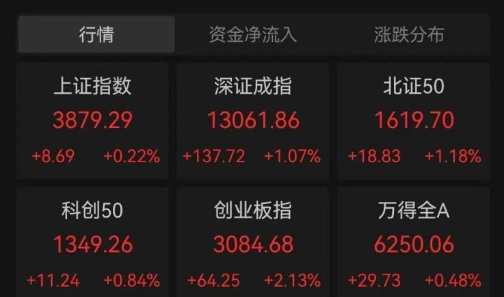 截至中午收盘,上证指数上涨0.22%,深证成指上涨1.07%,创业板指上涨2.13%,北证50指数上涨1.18%。