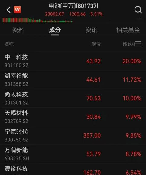 板块内其他股票方面,中一科技20%涨停,湖南裕能涨超11%,天赐材料、尚太科技涨停。