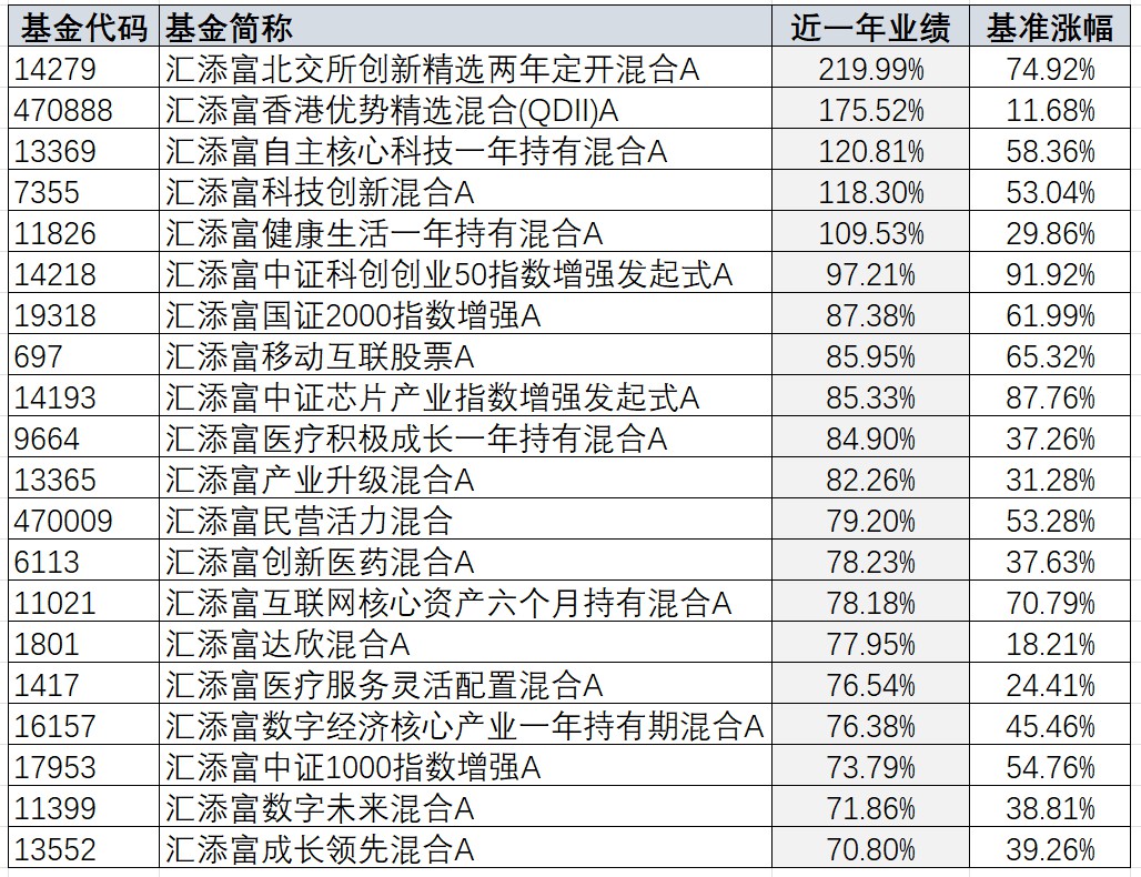 注:业绩翻倍、涨幅超70%、超50%的基金涨幅及基准数据如下:汇添富北交所创新精选两年定开混合A(219.99%/74.92%)、汇添富香港优势精选混合(QDII)A(175.52%/11.68%)、汇添富自主核心科技一年持有混合A(120.81%/58.36%)、汇添富科技创新混合A(118.30%/53.04%)、汇添富健康生活一年持有混合A(109.53%/29.86%)、汇添富中证科创创业50指数增强发起式A(97.21%/91.92%)、汇添富国证2000指数(9724.337, 104.63, 1.09%)增强A(87.38%/61.99%)、汇添富移动互联股票A(85.95%/65.32%)、汇添富中证芯片产业指数增强发起式A(85.33%/87.76%)、汇添富医疗积极成长一年持有混合A(84.90%/37.26%)、汇添富产业升级混合A(82.26%/31.28%)、汇添富民营活力混合(79.20%/53.28%)、汇添富创新医药混合A(78.23%/37.63%)、汇添富互联网核心资产六个月持有混合A(78.18%/70.79%)、汇添富达欣混合A(77.95%/18.21%)、汇添富医疗服务灵活配置混合A(76.54%/24.41%)、汇添富数字经济核心产业一年持有期混合A(76.38%/45.46%)、汇添富中证1000指数(7504.423, 85.19, 1.15%)(7504.2836, 85.05, 1.15%)增强A(73.79%/54.76%)、汇添富数字未来混合A(71.86%/38.81%)、汇添富成长领先混合A(70.80%/39.26%)、汇添富民营新动力股票(69.57%/52.38%)、汇添富ESG可持续成长股票A(69.16%/34.39%)、汇添富成长领航混合A(68.28%/32.56%)、汇添富数字生活六个月持有混合(66.98%/46.23%)、汇添富科创板2年定开混合(66.80%/65.86%)、汇添富沪港深大盘价值混合A(65.67%/35.71%)、汇添富安鑫智选混合A(65.60%/18.21%)、汇添富创新成长混合A(63.69%/33.23%)、汇添富数字经济引领发展三年持有混合A(63.43%/39.23%)、汇添富策略增长灵活配置混合(63.34%/28.41%)、汇添富均衡精选六个月持有混合A(61.56%/29.04%)、汇添富创新未来混合(LOF)(56.54%/33.54%)、汇添富中盘积极成长混合A(56.18%/39.56%)、汇添富核心精选混合(LOF)(56.00%/27.46%)、汇添富全球汽车产业升级混合(QDII)人民币A(55.44%/43.66%)、汇添富优势企业精选混合A(54.71%/33.23%)、汇添富优势行业一年持有混合A(54.11%/27.46%)、汇添富先进制造混合A(52.76%/59.32%)、汇添富经典成长定开混合(51.71%/31.89%)、汇添富创新增长一年定开混合A(50.86%/31.80%)、汇添富成长精选混合A(50.77%/33.23%)、汇添富文体娱乐混合A(50.40%/38.84%)、汇添富智能制造股票A(50.34%/66.56%)。上述基金业绩数据经托管行复核,基准数据来自汇添富基金,统计区间为2024/9/6-2025/9/5。