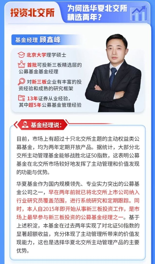 顾总有新三板工作经验,对北交所研究更加深刻,长期业绩跑赢北证50指数,尤其是3年业绩直接跑赢200%+,这超额太吸引人了$华夏北交所精选两年定开混合发起式$