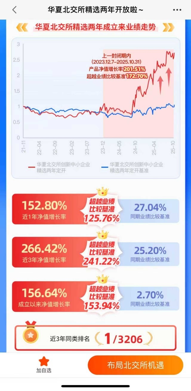 倒计时3天,$华夏北交所精选两年定开混合发起式$ 开放期快要结束了,这基近三年收益超249%,跑赢北证50指数200%+,在同类基金中排名第1,这么强的基,错过还要等两年了