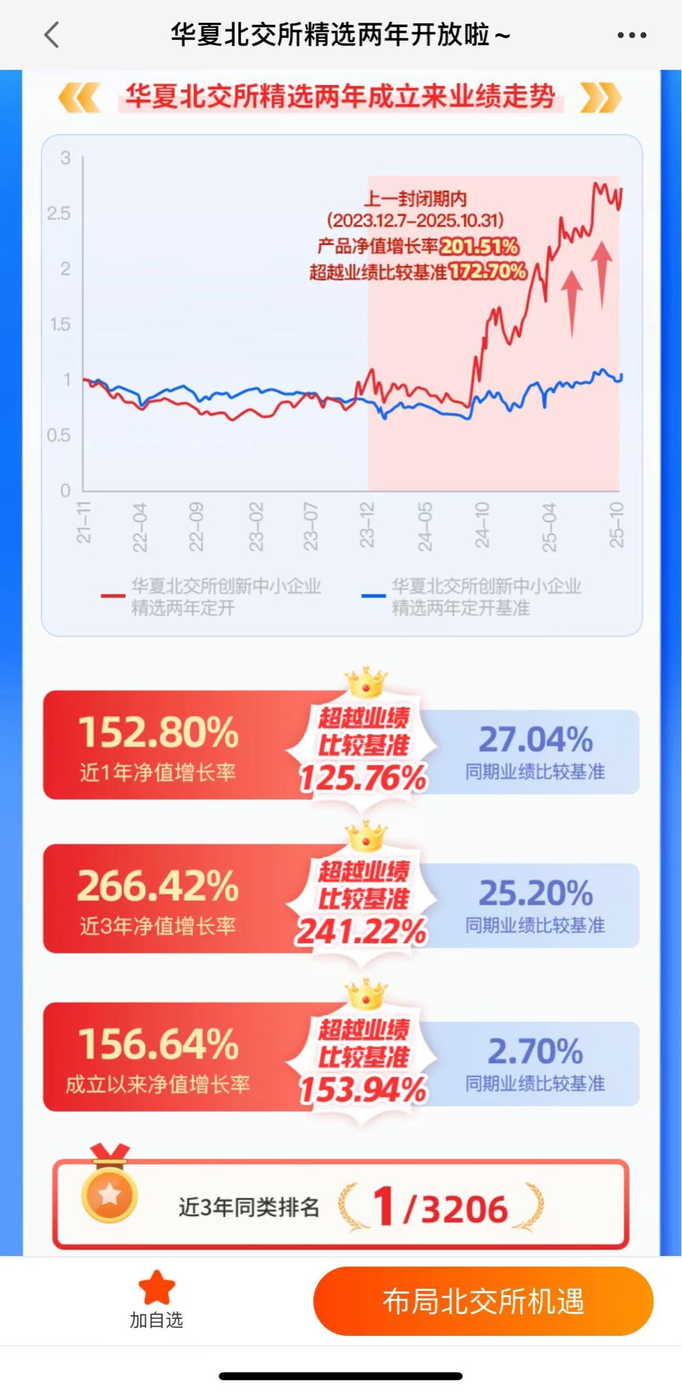 政策加大对新兴产业的扶持力度,北交所这只成长性更强,近3年249%+的收益,跑赢北证50指数200%+,收益也牛,继续复购了$华夏北交所精选两年定开混合发起式$