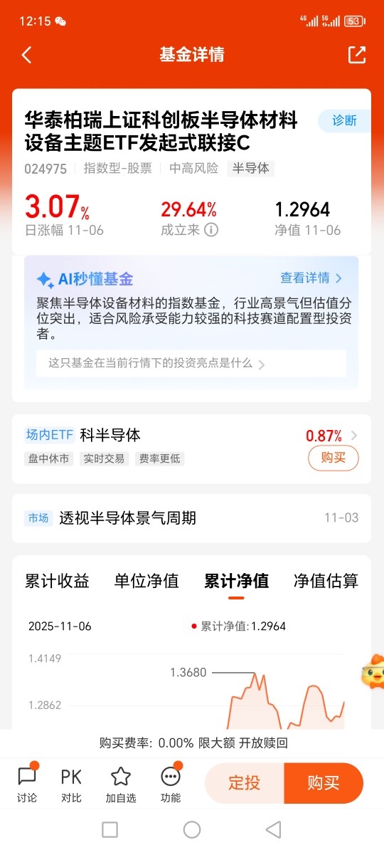 今天科创半导体设备这板块的表现,是不是让不少朋友心动了?打开行情一看,板块里不少股都在往上蹦,明显能感觉到这赛道现在热度高、景气度足——毕竟半导体设备是咱们芯片产业的“基建”,现在行业需求一直没下来。这时候就得说华泰柏瑞了,它就是锚定这板块的,今天跟着行情涨了3个多点,从成立到现在都快30%的收益了。咱买这个不用费脑子选个股,直接跟板块行情走,而且C类申购费是0,对想轻仓布局科技的朋友挺友好。不过得说清楚,这属于中高风险哈,得能接受波动的朋友再入手~#11月基金投资策略#