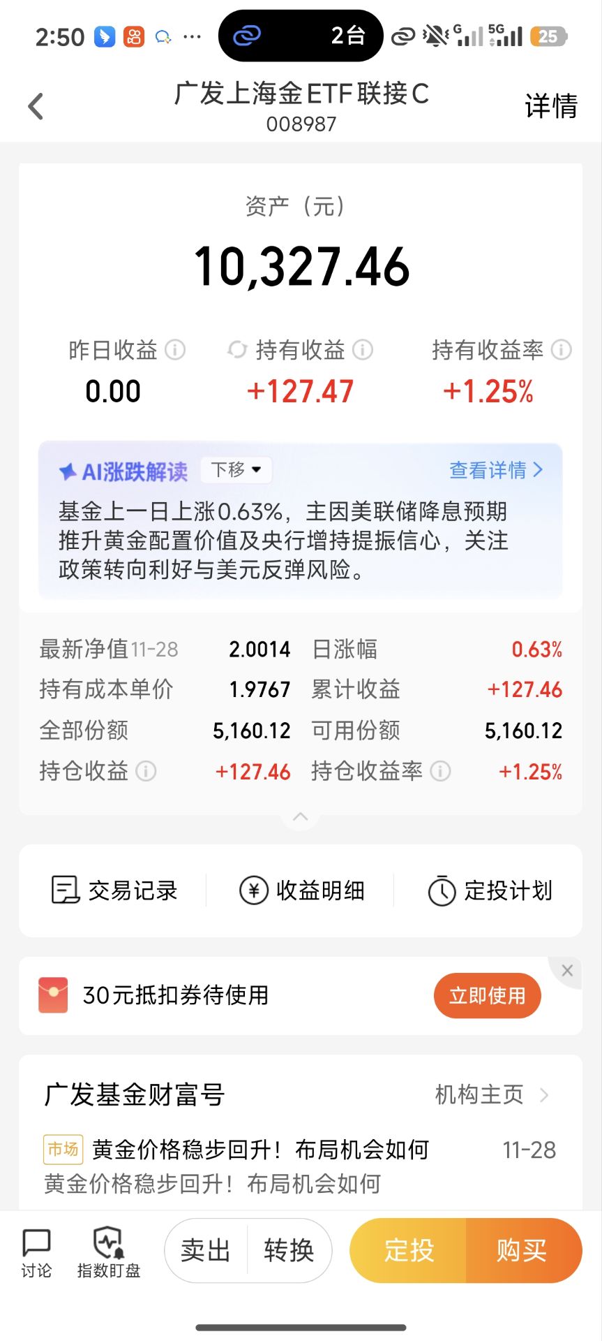 小沐持有的$广发上海金ETF联接C(OTCFUND|008987)$ 也开始吃肉了!