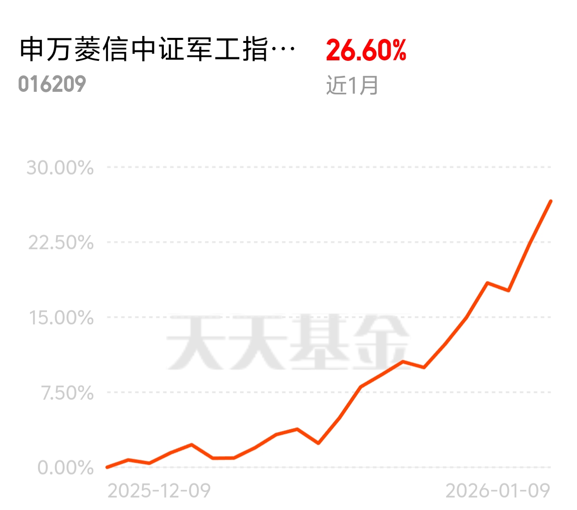 特朗普军费增加带动军工产业链上涨,从上游到下游全面受益。军工也好起来了,商业航天启航,申万菱信中证军工指数 (LOF) C 近 1 月 26.60%,跟踪指数超稳,后续有支撑,我不急着止盈。$申万菱信中证军工指数(LOF)C$