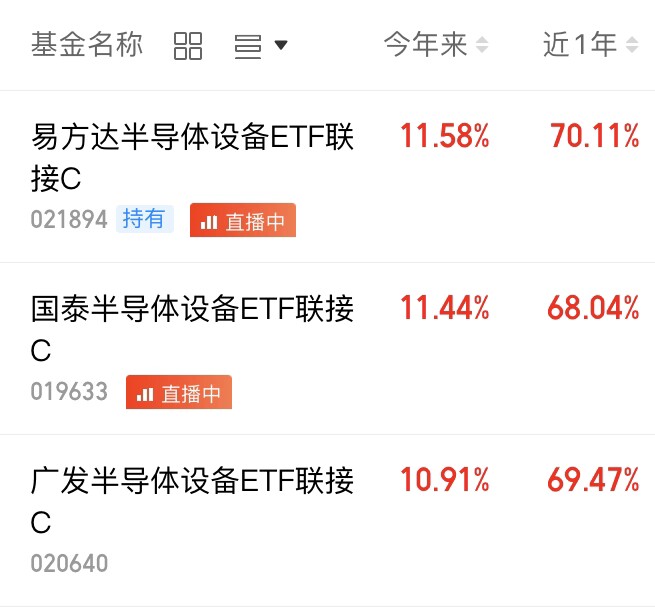半导体设备是半导体里质地更优的子板块,弹性高且行情持续性强,特别受机构资金青睐。我持有的易方达半导体设备 ETF 联接 C 也在加仓计划里,目前持有收益还不错。国产替代在加速,有政策和资金双重支持,加上国内算力需求持续提升,产业链订单预期越来越好。从全年布局来看,现在入手这只基金长期投资胜率高,今天我打算继续加仓布局。