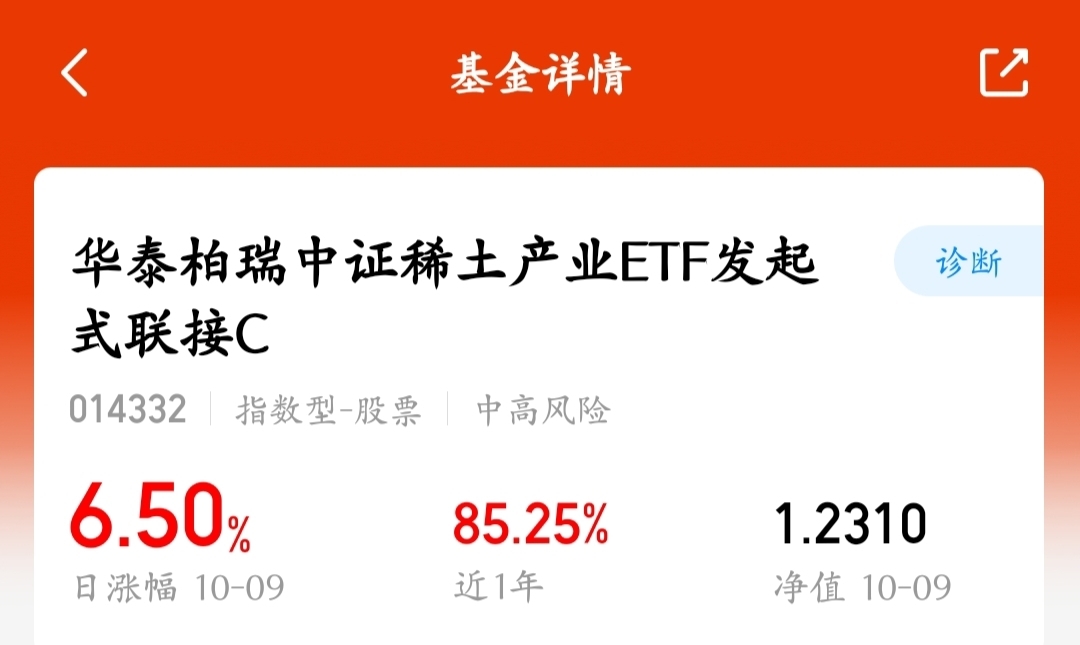 今天稀土板块爆发,$华泰柏瑞中证稀土产业ETF发起式联接C$单日涨6.5%,近一
