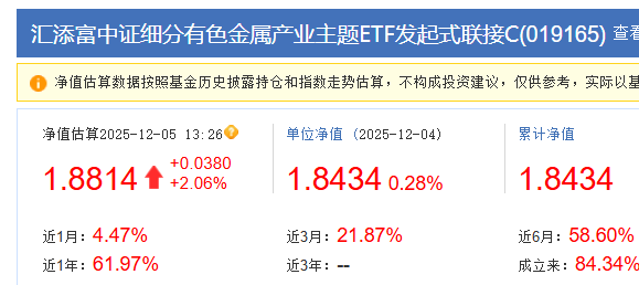 今天看行情表现得还是不错的,科技没有延续涨幅,目前的行情连续性最好的还是在资源方向,关注中的$汇添富中证细分有色金属产业主题ETF发起式联接C$ 继续拉升,3连击,6天涨5天,今天右侧布局一波,从沪深300转进来,跟上有色牛行情!为什么笃定有色还能再冲,看近期铜价狂飙,创历史新高,供需失衡,叠加锡供应紧平衡,半导体景气回升,封装锡焊料需求提升,推动沪锡价格冲上三十万,白银现货今年涨幅更是超90%,叠加12月降息驱动大宗价格整体抬升,资金自然顺流而上。