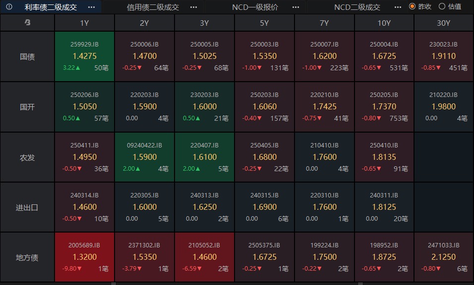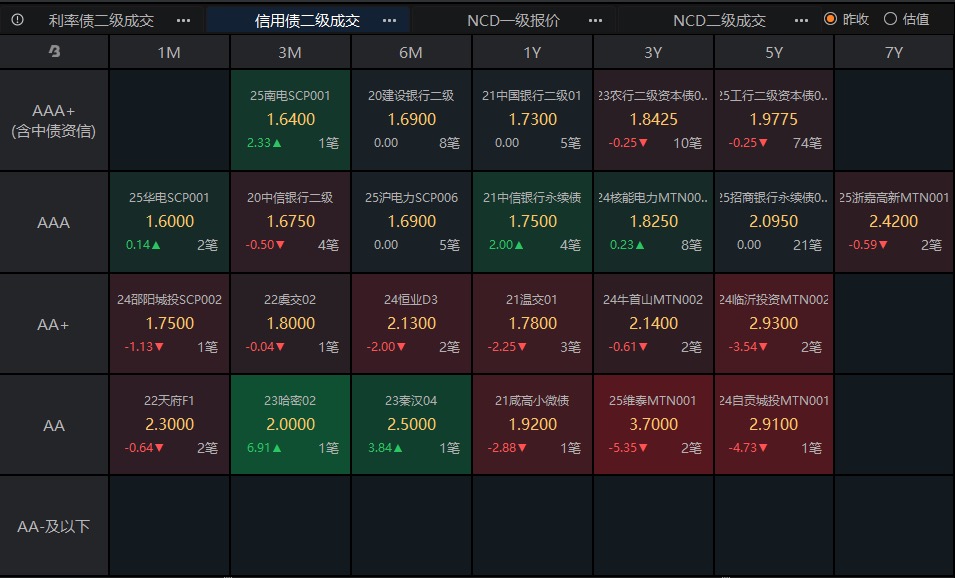 在债市盘面表现上,国债期货全线反弹,十年国债收益率围绕1.67%窄幅震荡 ,资金主要买入票息较高的长久期利率债和中长久期、中低等级信用债。上午收盘时,利率债逐步拉升,5 - 10年期有3 - 7个蛋的涨幅,7 - 10年期大概5 - 7个蛋涨幅,华子大概8 - 9个蛋涨幅 ;信用债相对分化,低评级城投债涨势不错,但银行债多数下行和平盘,产业债和城投债中长端涨幅稍有回落。