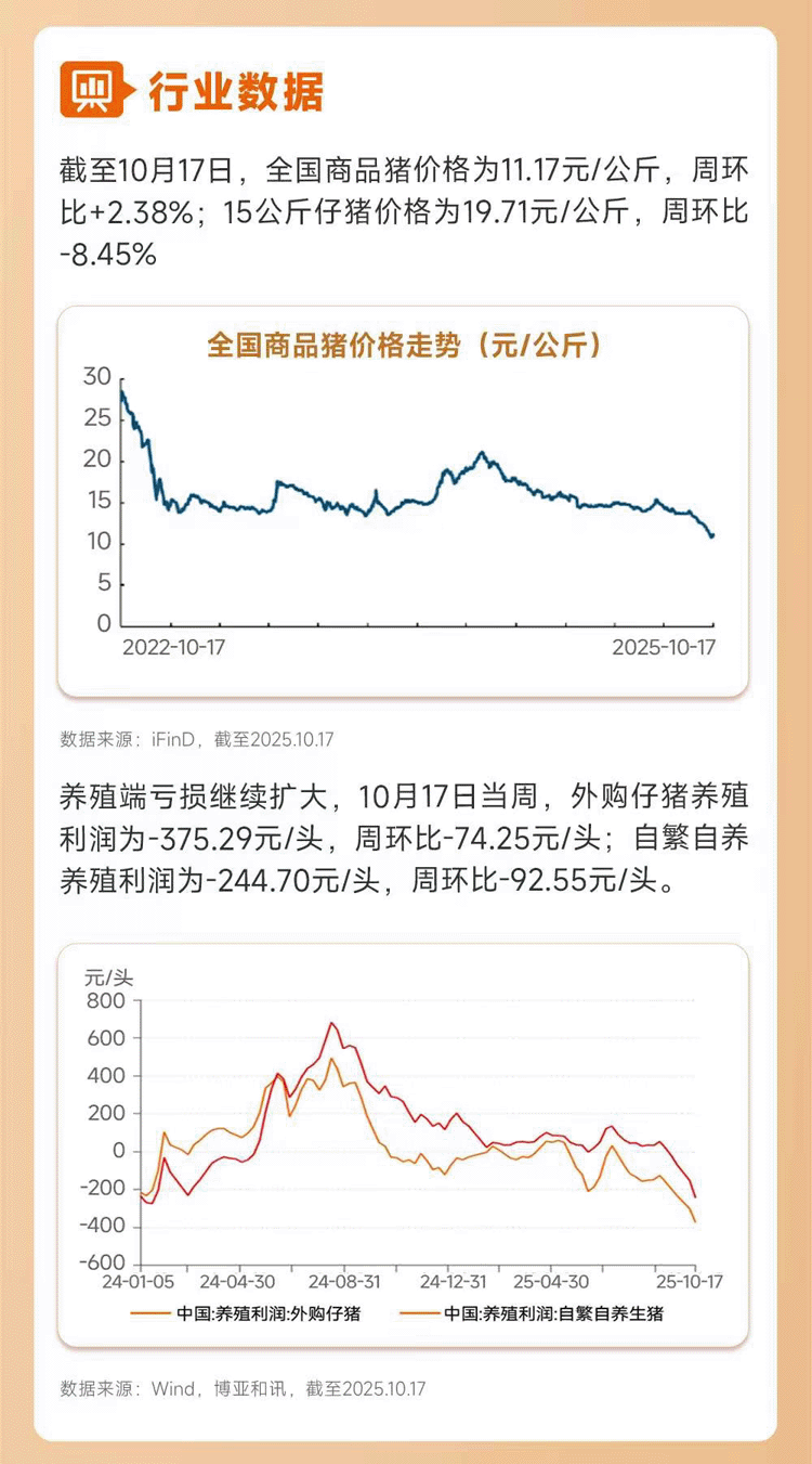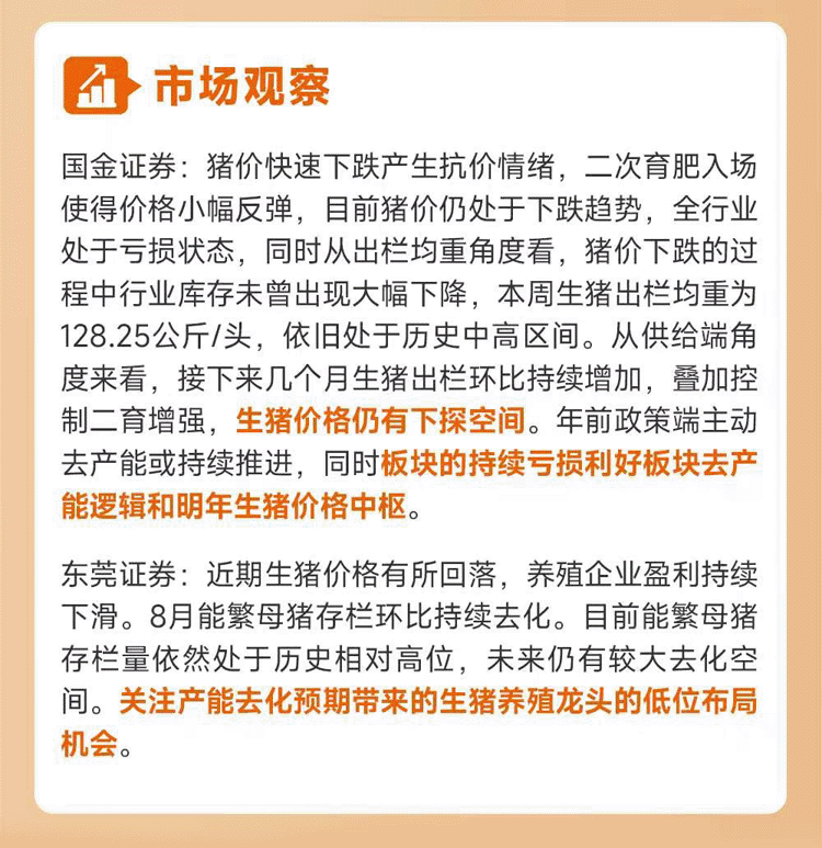 东莞证券:近期生猪价格有所回落,养殖企业盈利持续下滑。8月能繁母猪存栏环比持续去化。目前能繁母猪存栏量依然处于历史相对高位,未来仍有较大去化空间。关注产能去化预期带来的生猪养殖龙头的低位布局机会。