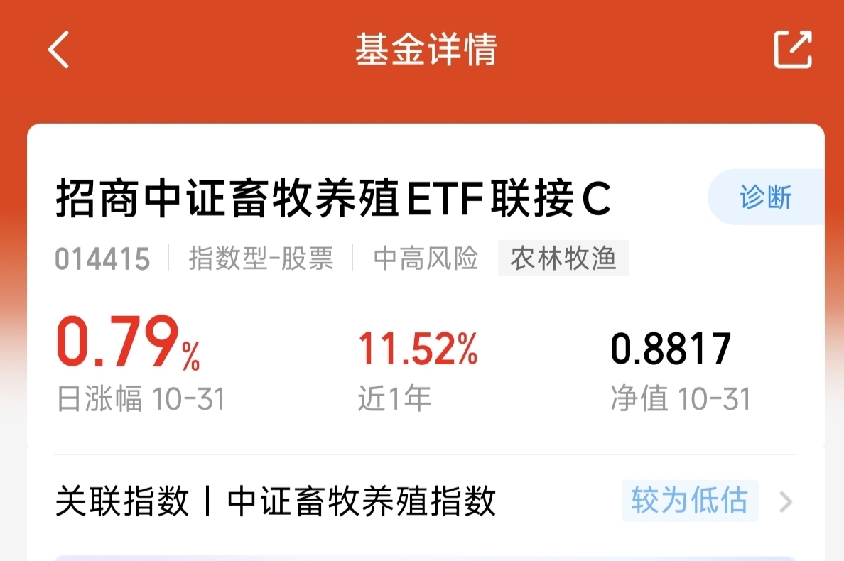 今天有关注到$招商中证畜牧养殖ETF联接C$ 这只聚焦畜牧养殖的指数基金,紧跟中证畜牧养殖指数。全面覆盖养殖上下游产业链。指数目前估值处于历史低位。性价比非常的高。基金紧跟指数的表现一直不错。上周五上涨了0.75%。今天估值又上涨超0.5%。已经走出连涨反转的上涨行情。目前位置整体比较低,我看好未来的成长表现。准备把科技的仓位转换过来。