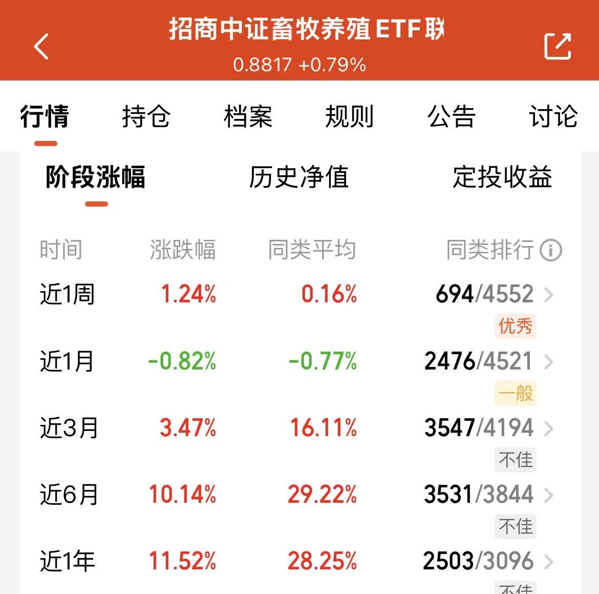 今天大A震荡调整,板块涨跌不一,畜牧养殖逆势上涨,眼下市场处于供需博弈的阶段,最新十五五规划也强调农业现代化,政策也对畜禽养殖、规模化养殖支持,近期板块轮动也快,所以均衡持仓也是比较重要的。$招商中证畜牧养殖ETF联接C(OTCFUND|014415)$近六个月涨幅10.14%,也是不错的,今天估值上涨1.56%,可以坐等吃肉了!