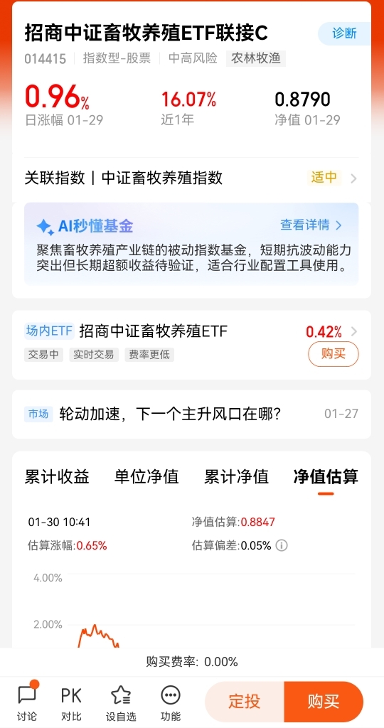 $招商中证畜牧养殖ETF联接C$ 昨天上涨0.96%,今天实时涨幅0.65%。市场资金高低切,看来可以多关注低估值板块,专注修复行情做防守。轮动加速,也许下一个风口就是畜牧。