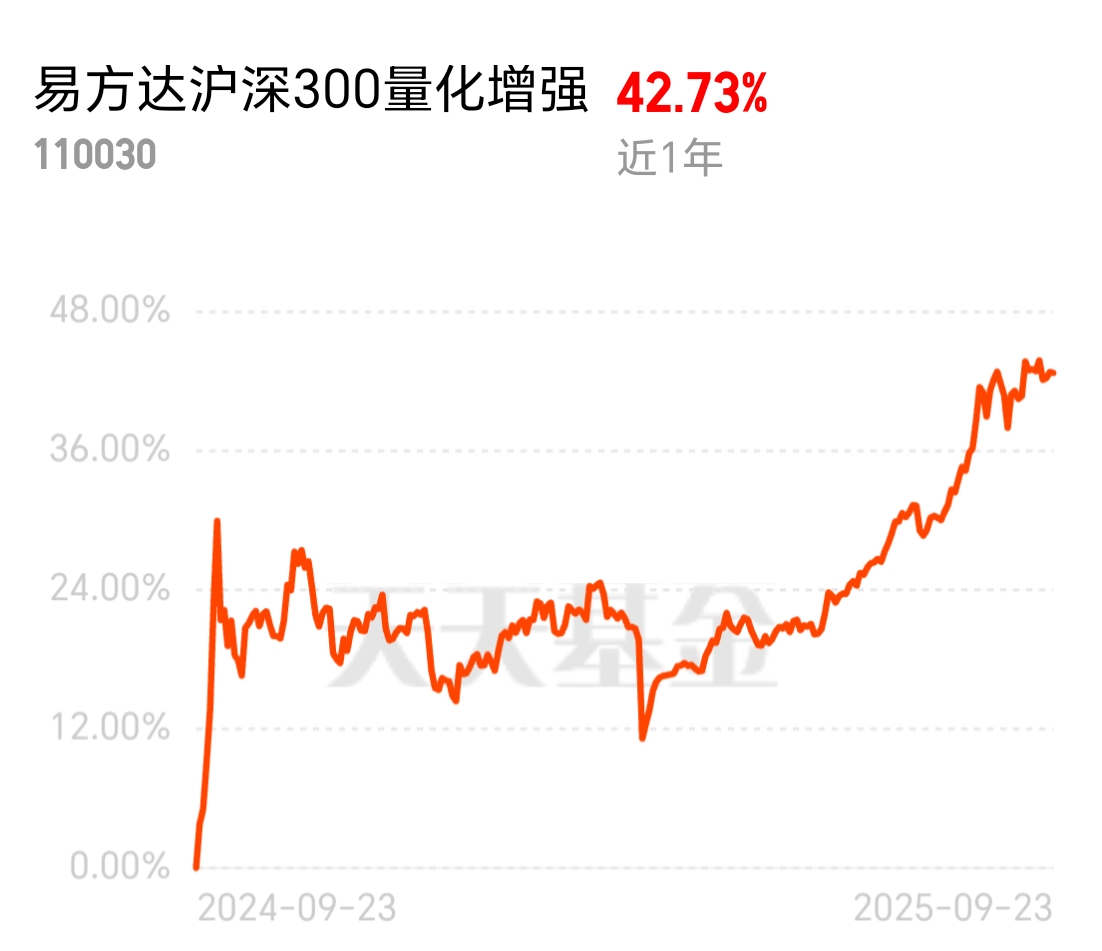 聊到轮动行情的靠谱基金,我提了这只。易方达沪深300量化增强近1年42.73%,今年18.33%跑赢指数,值得持有。