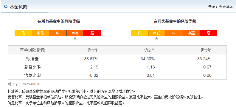 从风险指标来看,该基金近一年标准差为38.67%,夏普比率2.19,信息比率-0.02,表明基金虽然波动较大,但风险调整后的收益相对较好。