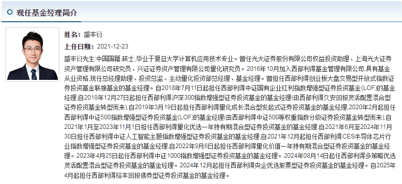 西部利得CES芯片指数增强C基金目前由盛丰衍和张昌平共同管理。盛丰衍自2021年11月27日开始管理该基金,累计任职时间为8年300天,现任基金资产总规模63.36亿元。张昌平则于2025年9月6日加入管理团队,累计任职时间为4年330天,现任基金资产总规模15.68亿元。