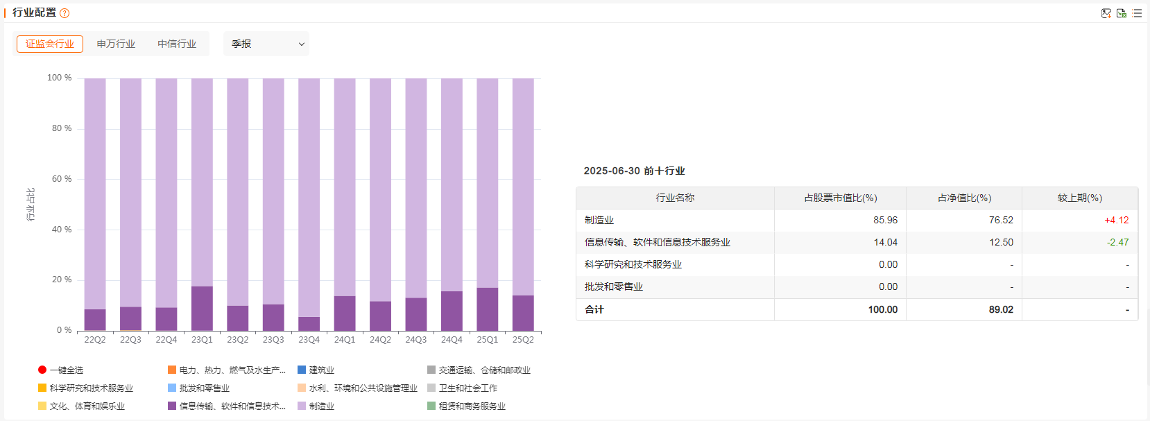 基金的行业分布以制造业为主,占72.34% ,信息传输、软件和信息技术服务业占13.52% ,两者合计占基金资产净值的85.86% 。这种行业集中度反映了基金对半导体产业链核心环节的专注投资策略。在港股通配置方面,基金通过港股通投资的港股公允价值占期末资产净值比例为8.58% ,但具体港股标的未明确列出,需进一步确认。
