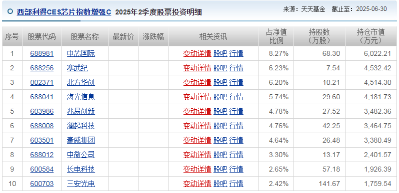 西部利得CES芯片指数增强C基金的持仓结构高度集中于半导体行业,体现了其主题投资的特点。截至2025年6月30日,基金前十大重仓股合计占比48.99% ,主要集中在半导体设计、制造和设备领域。