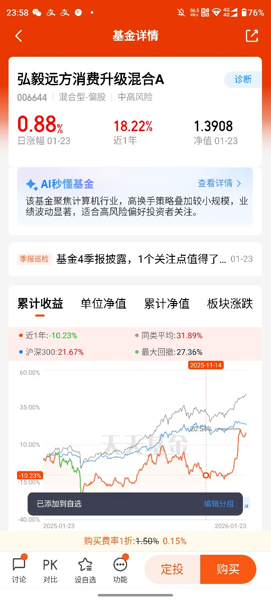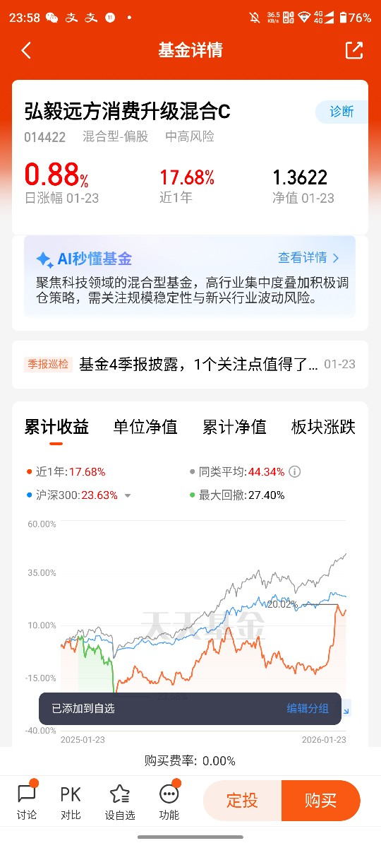 如今,AI应用和AI智能体已经从概念走进现实,深度融入消费生活的方方面面,既改变了我们的消费方式,也推动了各领域的消费升级。作为投资者,我看好AI赋能下的消费升级赛道,也坚定持有弘毅远方消费升级C,相信基金能精准捕捉AI应用带来的消费机遇,分享行业发展红利。未来,随着AI技术的不断成熟,会有更多实用的AI应用走进生活,让消费更智能、更便捷、更有温度,也让我们的投资更有底气。@弘毅远方基金