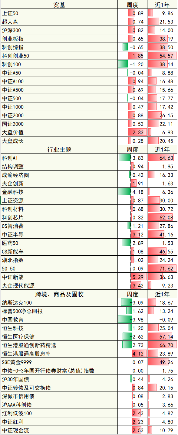 数据来源:上海证券交易所,深圳证券交易所,中证指数有限公司,上海黄金交易所,中央国债登记结算有限责任公司,纳斯达克股票市场公司,标准普尔公司,恒生指数有限公司,WIND,博时基金,周度统计区间2025.11.3-2025.11.9,近一年统计区间2024.11.9-2025.11.9。指数历史表现不预示未来,不代表相关产品收益。