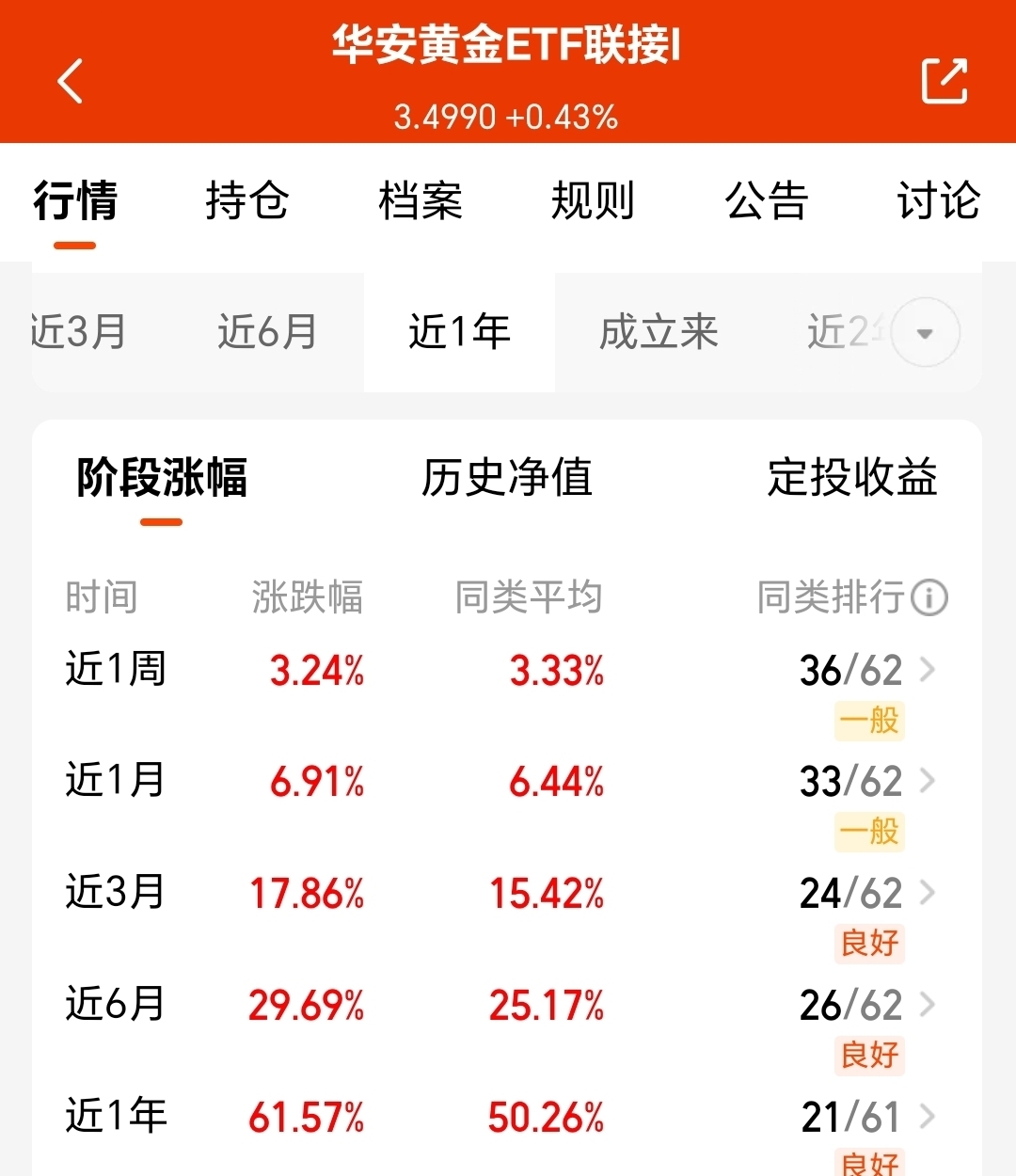 $华安黄金ETF联接I$ 年涨 61.57% 费率最低,中风险配置,能稳稳赚取黄金赛道收益